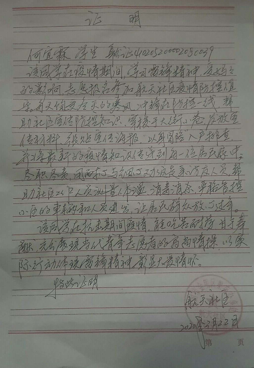 何宜霖,电气1801班学生,疫情爆发后,受其母亲影响报名了梁苑航天社区疫情防控值班,帮助社区宣传防控知识,“以身冒险”入户排查,帮助社区工作人员测量体温,严格管控进入小区的车辆等,受到了社区的好评。何宜霖疫情防控过程中表现出了一名大学生应有的时代担当,值得同学们学习。