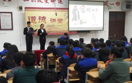 在“看一部短片”环节里,大家共同观看了“2016感动中国十大人物最美村官秦玥飞”的事迹短片。自2011年担任“大学生村官”以来,他立足农村实际,心系村民群众,动员多方社会资源,积极募集资金,倾心公益事业,在帮助硬化村级道路、安装路灯、改善农田灌溉设施、引进信息化教育设备、改扩建敬老院、提供校车安全保障等方面积极努力,无私奉献,为当地谋取民生福祉作出了较大贡献,深受乡村干部和广大群众的一致好评。在“学一点儿礼仪”环节,大家欣赏了相声“爱的奉献”手语主题表演;“诵一段经典”环节,师生诵读了于谦的《咏煤炭》。在“作一个承诺”和“唱一首歌曲”环节,全体师生共同做出道德承诺并合唱了革命歌曲《学习雷锋好榜样》。