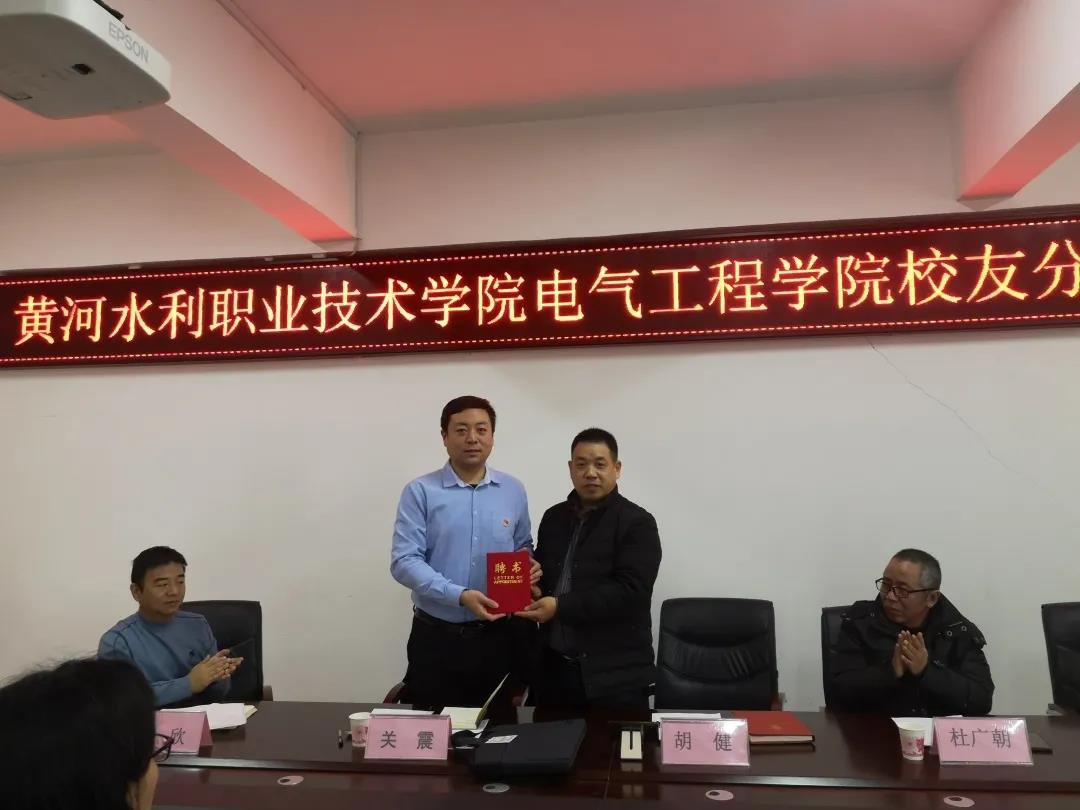 电气工程学院副院长王磊宣读了电气工程学院校友会第一届理事名单,并由党总支书记胡健为电气工程学院第一届校友分会会长关震颁发聘书。