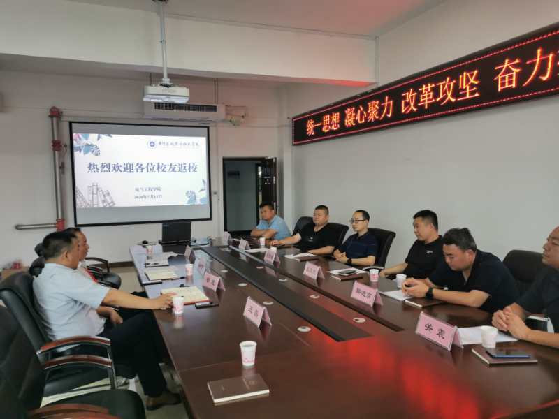 时逢河南省黄河水利职业技术学院校友会成立大会召开之际,2020年7月11日下午,电气工程学院校友在实训楼5521会议室举行座谈会。学院党总支书记胡健、院长杜广朝、副书记管欣、副院长王磊,以及各教研室主任、三办主任参加了座谈会,会议由副书记管欣主持。