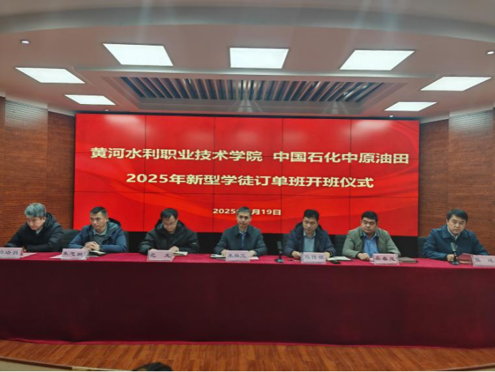 2025年2月19日,我院与中国石油化工股份有限公司中原油田分公司联合设立的2025年新型学徒订单班开班仪式在我校4号实训楼演播厅成功举行。我校副校长朱焕立、中原油田人力资源部专家马传根出席开班仪式,电气工程学院党总支书记张延主持,电气工程学院、机械工程学院师生以及企业相关负责人参加了此次仪式。
