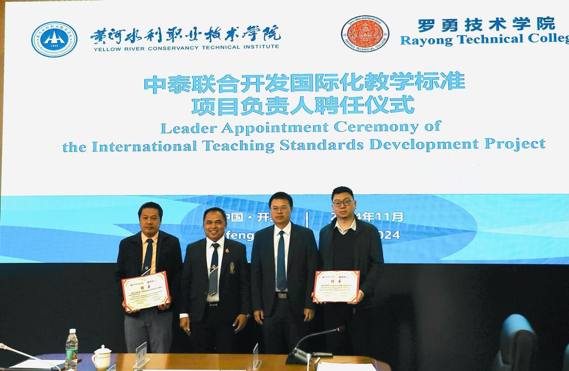 随后,校长胡昊与罗勇技术学院校长吉迪蓬·乌塔玛维特共同为中泰国际化教学标准开发项目负责人颁发聘任证书。双方就大禹学院课程设置、学生培养,以及当前中泰两国职业教育的最新政策变化进行了深入交流。