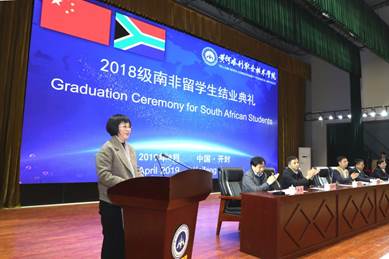 4月10日上午,我校隆重举行2018级南非留学生结业典礼。校党委副书记、校长祝玉华,副校长菅浩然,我校校友、中铁二十局市政工程有限公司开封项目部副经理平帅军出席典礼。相关部门和学院负责人、任课教师代表、2018级南非留学生参加典礼。典礼由对外联络与合作处副处长姬尧主持。
