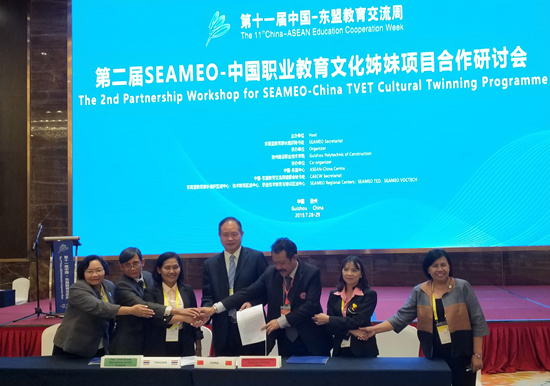 在“第二届SEAMEO—中国职业教育文化姊妹项目”合作研讨会上,我校丰硕的国际化办学成果得到东盟多国院校的关注。经过两天的商讨和交流,我校与印度尼西亚、老挝、柬埔寨等东盟国家的12所学校签订了合作备忘录,在教师短期培训、师生交换、学生实习实训、留学生培养等方面达成多项合作意向。