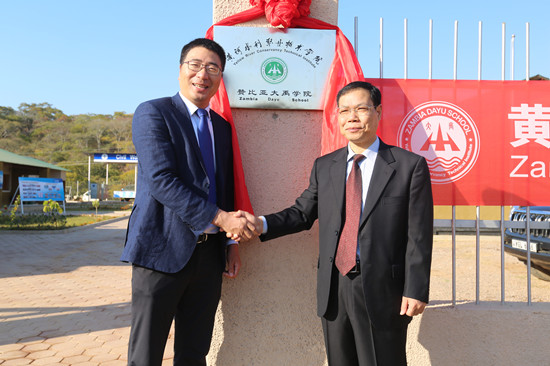 我校党委书记许琰和中水十一局赞比亚下凯富峡施工局局长周庆国为“赞比亚大禹学院”揭牌