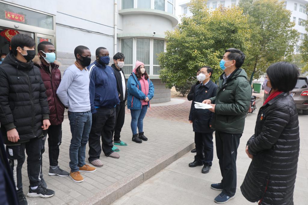 李镇转达了外交部、河南省委省政府对留学生的亲切问候,充分肯定了我校留学生疫情防控工作,并表示省委外办将积极配合教育部门和各高校,采取切实措施,确保留学生工作的安全与稳定。随后,省委外办领导向留学生分发了慰问品和防护用品,希望他们积极配合学校有关工作,增强战胜疫情和困难的信心,早日打赢这场防疫战。