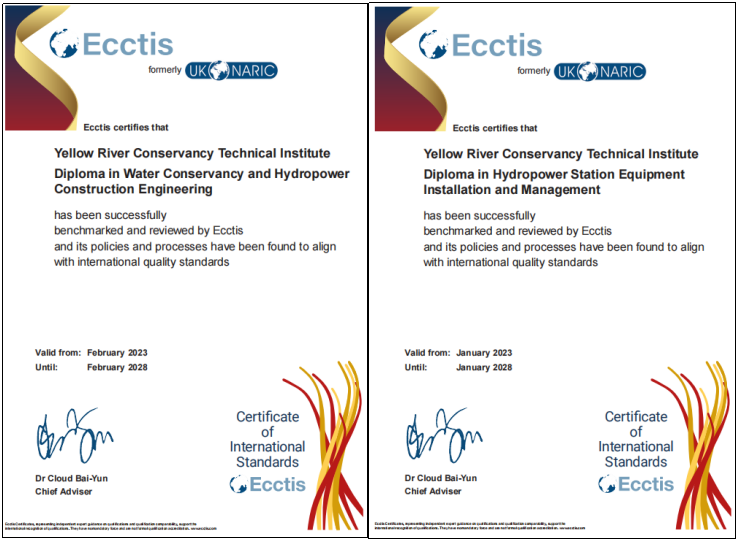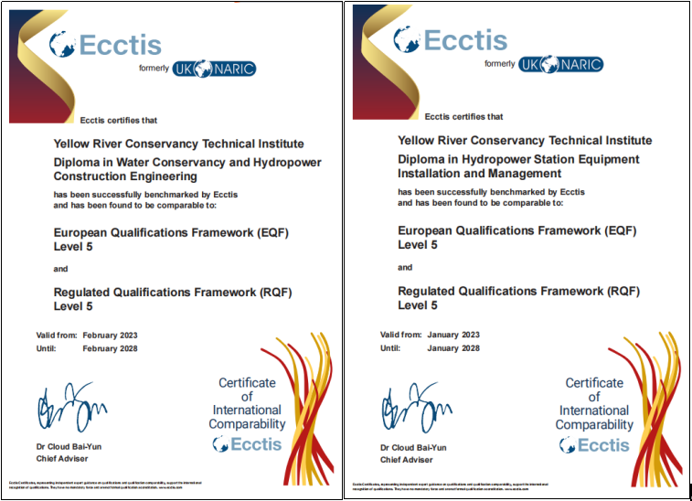 近日,我校“水电站设备安装与管理”和“水利水电建筑工程”两个专业正式通过英国国家学历学位评估认证中心(UK ENIC)国际专业标准评估认证,取得UK ENIC国际质量标准证书和国际可比性证书,学校的政策与程序符合国际质量标准,专业达到了英国资历框架(RQF)和欧洲资历框架(EQF)5级水平。