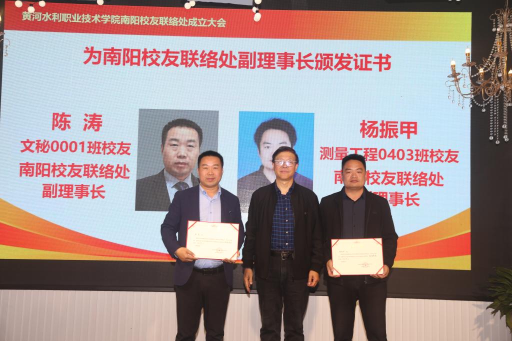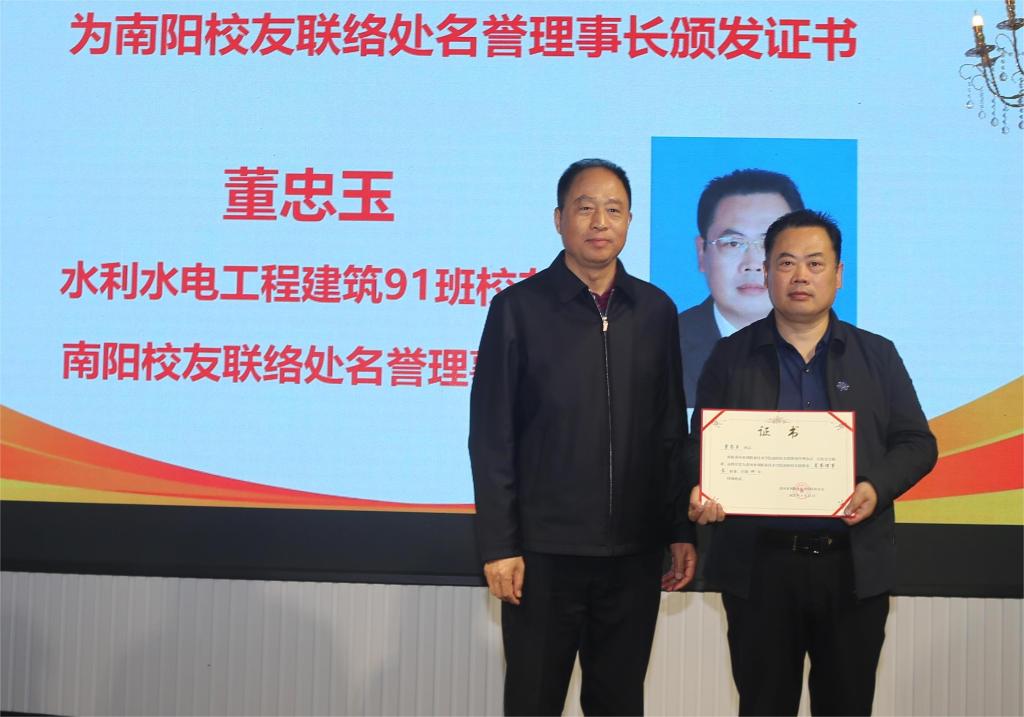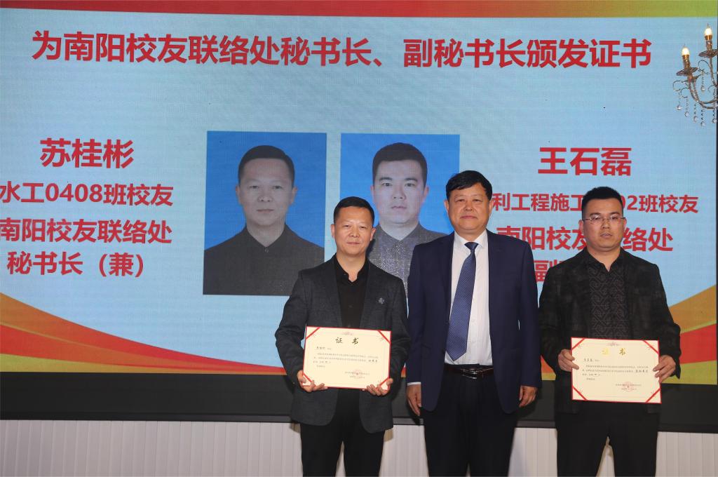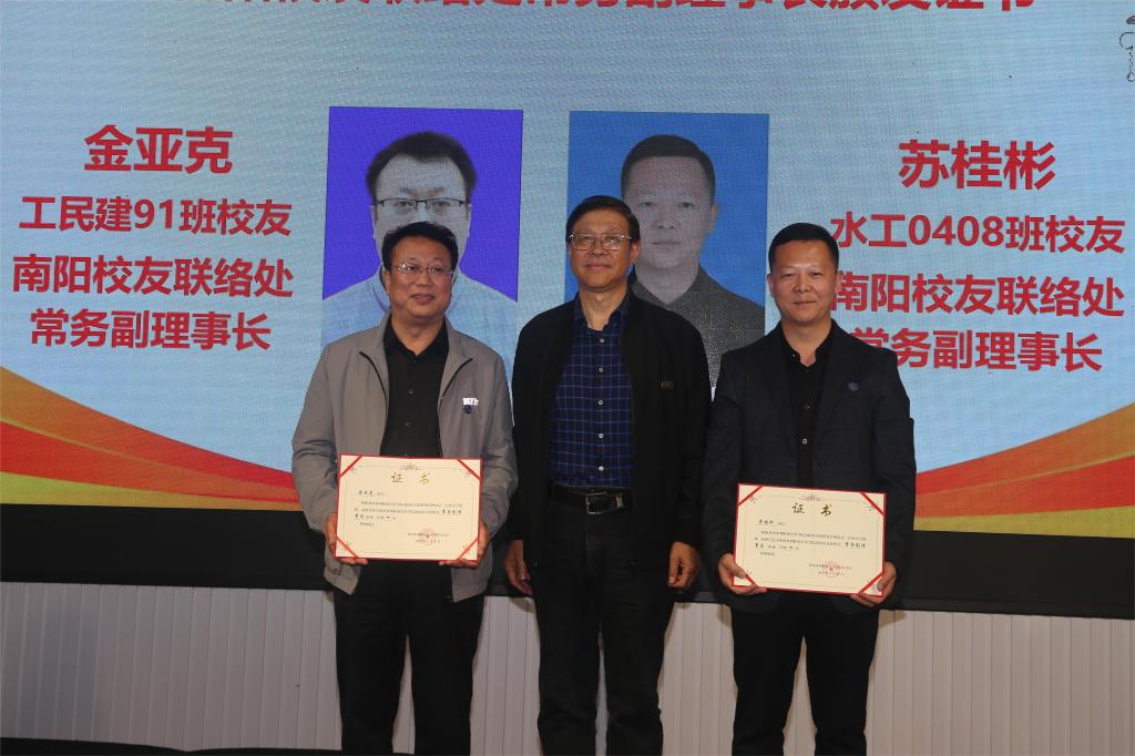 会长赵国训、南阳校友联络处名誉理事长董忠玉共同为联络处揭牌。赵国训、王卫东、李纪宾为当选的首届理事会负责人颁发聘书。