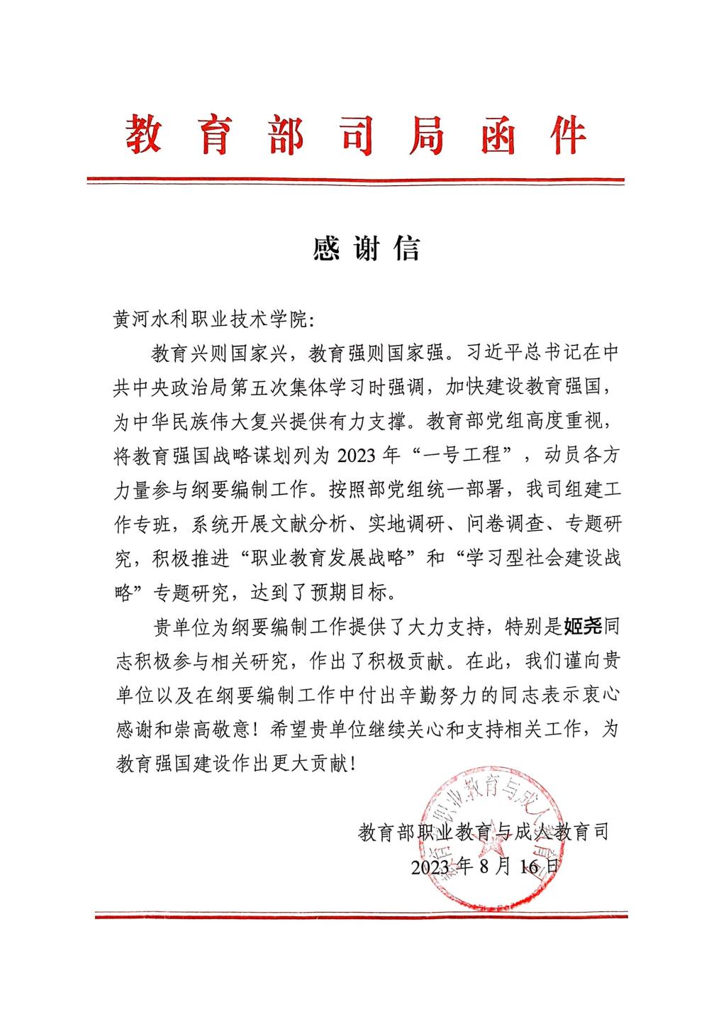 近日,教育部职成司来函对我校参与教育强国纲要编制工作给予充分肯定。