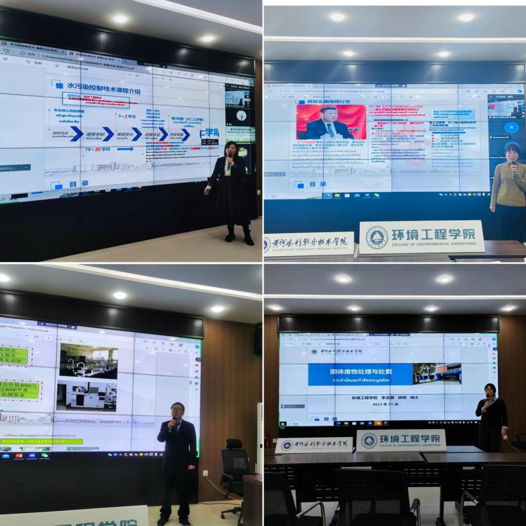 开幕式结束后,耿悦、孙莉莉、黄帅、李玉静四位骨干教师分别围绕课程概况、教学团队、实验实训条件、岗课赛证融通及职业能力分析等方面,讲授了《水污染控制技术》《大气污染控制技术》《环境监测》《固体废物处理与处置》课程,并向泰国高校师生介绍了学校智慧水务虚拟仿真实训中心及产教融合实践中心建设情况,展示了学生在校内可实现学中练、练中学,助力充分培养精操作、懂工艺、会管理、善协作、能创新的高素质技术技能人才特色。