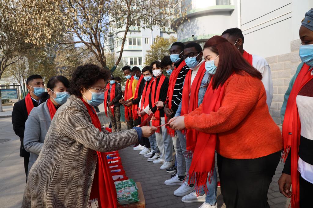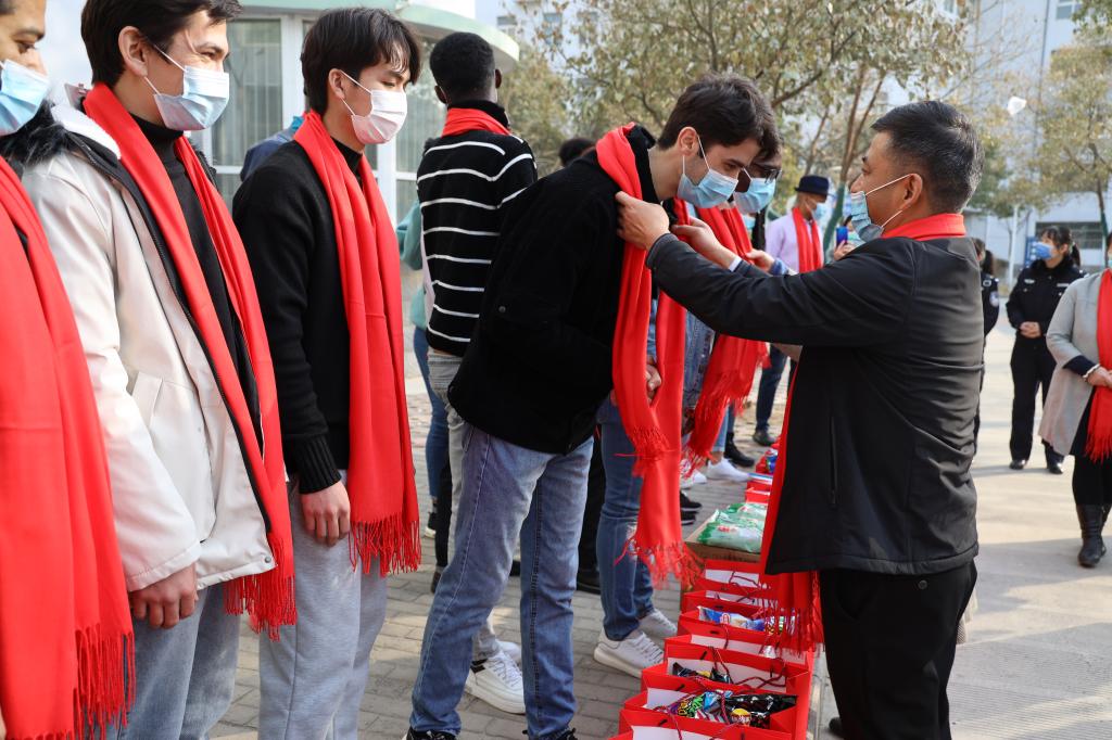 周书记对疫情期间同学们配合和支持学校的各项工作表示感谢,并就寒假期间的学习和生活情况与留学生进行亲切地交流,她叮嘱同学们要继续做好科学防护,注重个人健康、加强锻炼,度过一个快乐平安的中国年,并亲自为留学生佩戴象征福气的红围巾、发放新春礼物。同时,她向市出入境管理部门和金耀派出所的同志对我校来华留学生工作的支持与帮助表示感谢。
