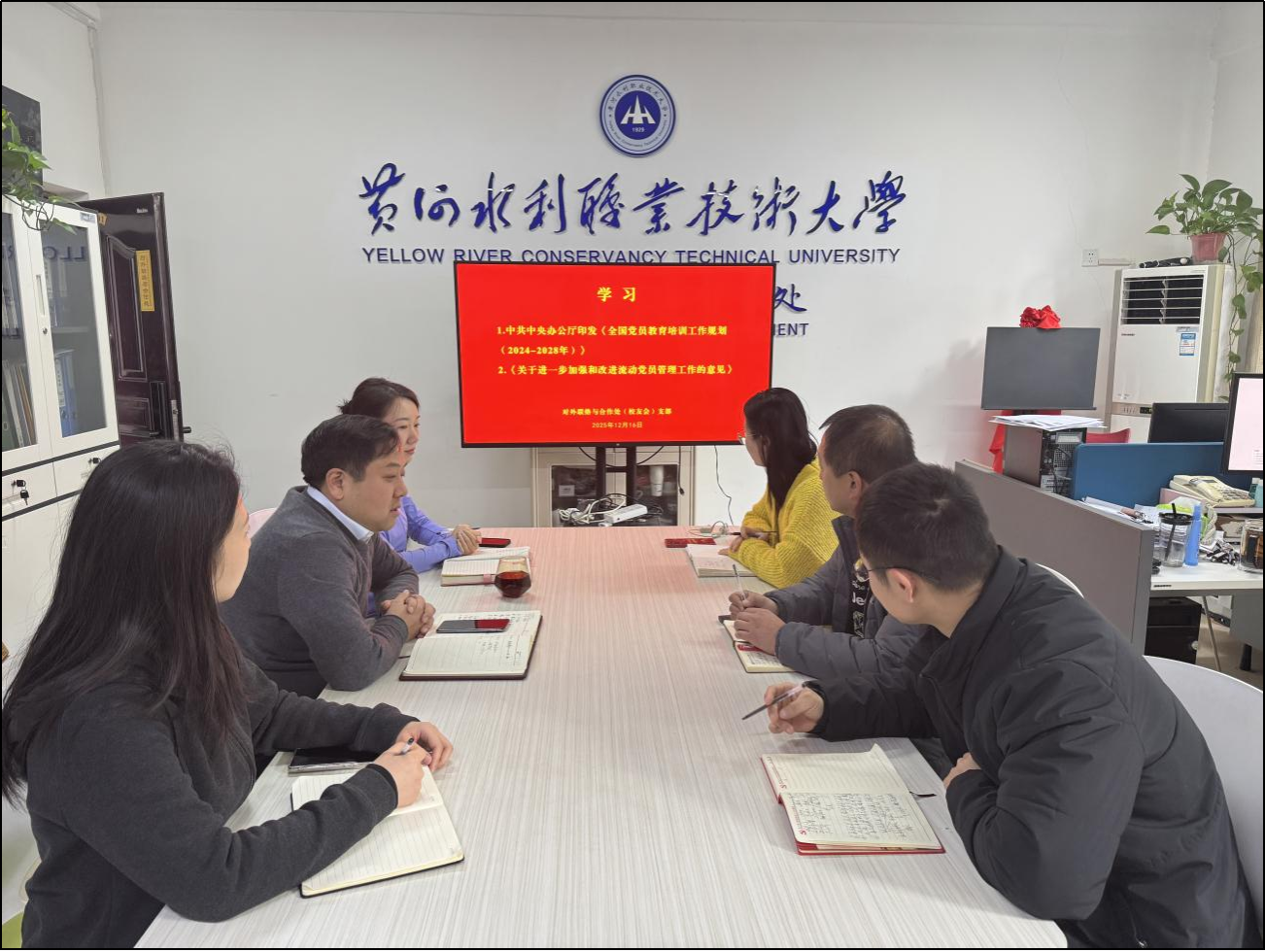 2025年12月16日,对外联络与合作处(校友会)支部在行政楼101会议室组织开展政治理论学习。支部书记姬尧主持会议,支部全体在校党员参会。