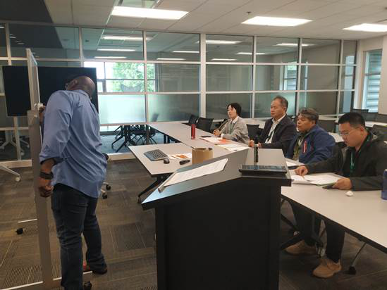 Ten members of the delegation were divided into two groups, including survey and construction engineering, for conducting relevant professional learning and exchanges during their stay in the United States. The survey group visited the indoor training room of the marine technology specialty of NMC. Besides, they followed the students to learn the theory teaching of sonar detection and optical fiber detection and participated in distance teaching. In the classroom of Mr. Phil McCuien, the construction engineering team studied the roof construction of wooden structure houses, and learned the practice and experience of Mr. Brian Sweeney in intelligent teaching and his student assessment method.