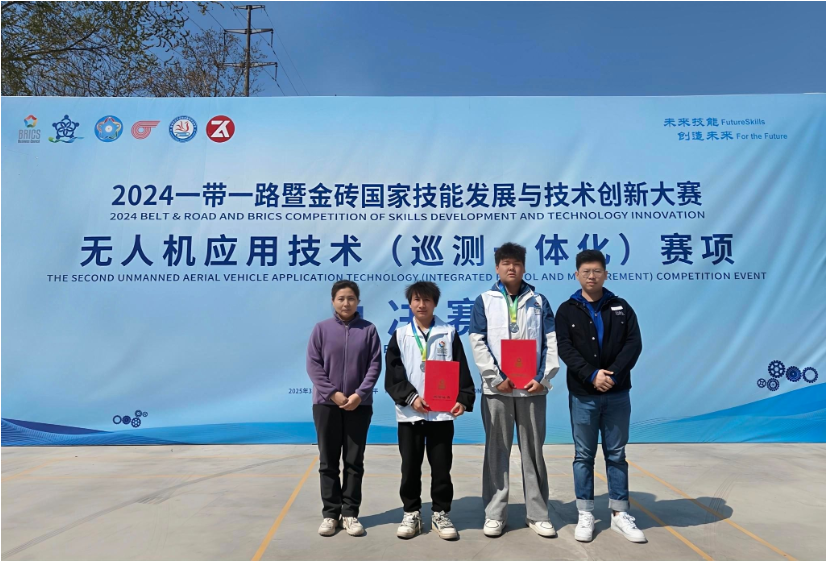 From March 27 to 30, the final of the Second Unmanned Aerial Vehicle Application Technology (Integrated Patrol and Measurement) Competition Event of the 2024 Belt & Road and BRICS Competition of Skills Development and Technology Innovation was successfully held at the Vocational Education School in Chiping District, Liaocheng City, Shandong Province. Teachers Zhang Hui and Cui Yaohui from the School of Surveying and Mapping Engineering, along with students Hu Ziyang and Zhou Yuhan, successfully advanced to the national final through the online preliminary contest. After two days of fierce competition, Hu Ziyang and Zhou Yuhan won a National Second Prize, teachers Zhang Hui and Cui Yaohui were awarded Excellent Instructors, and YRCTI received an Excellent Organization Award.