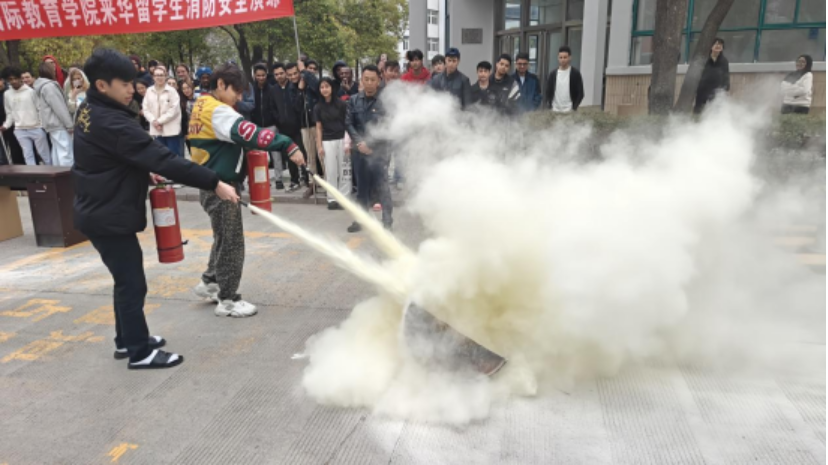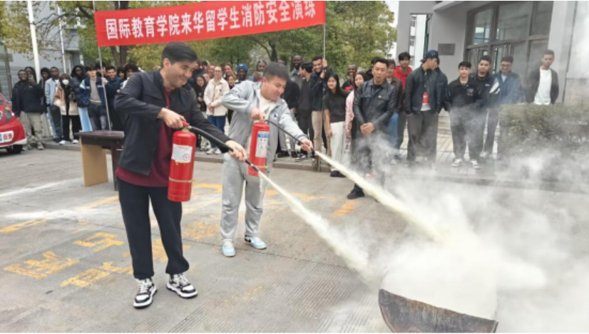 “Remember four steps of ‘lift, pull, hold, and press’ when using a fire extinguisher,” under the guidance of the staff, international students took turns picking up fire extinguishers and experiencing the fire-extinguishing process.Andres , an international student from Ecuador, excitedly said, “This is my first time using a fire extinguisher. Although I am a bit nervous, it’s very practical!”