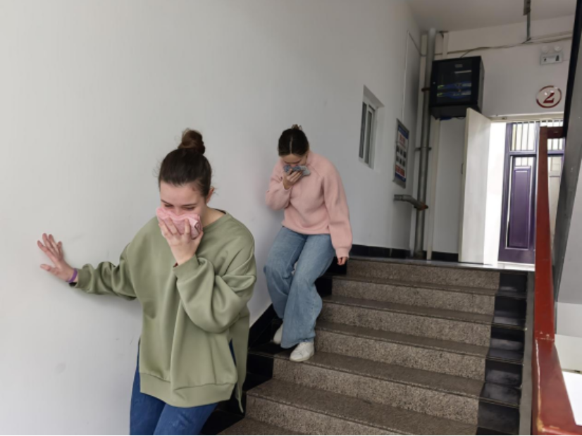 After that, the simulated fire escape was carried out. As the alarm sounded, international students, guided by the staff, covered their mouths and noses with damp towels, bent low, and followed the safety exit signs to evacuate swiftly and orderly to the safe area.