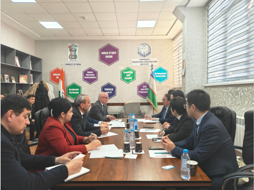 Zhou and the delegation were discussing with the relevant personnel of Namangan Engineering Construction Institute.