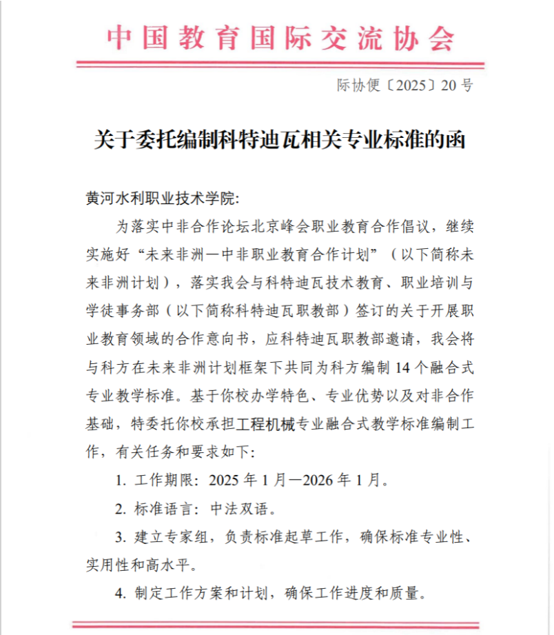 In January 2025, the China Education Association for International Exchange officially included the Integrated Teaching Standard for Engineering Machinery developed by YRCTI into the Future Africa Program, as one of the 14 integrated specialty teaching standards for Ivory Coast. This not only marks a solid step taken by YRCTI in the international cooperation in vocational education between China and Africa but also reflects YRCTI’s leading position in the specialty of engineering machinery.