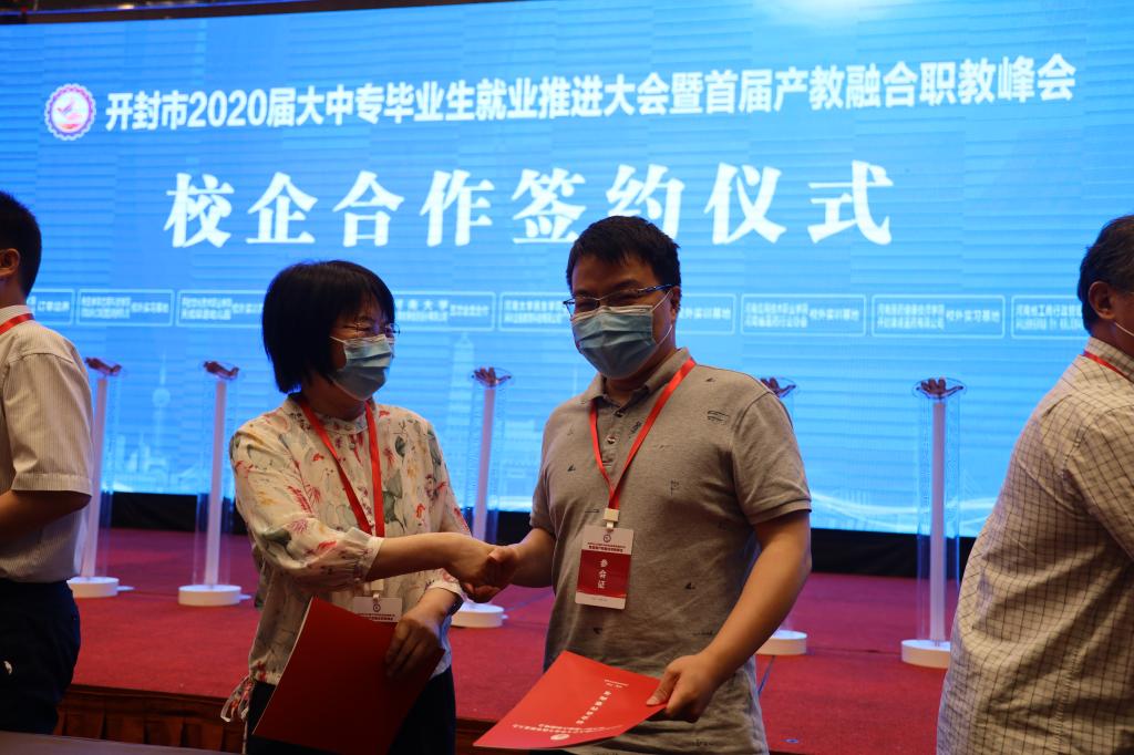 On June 19, the 2020 Employment Promotion Conference for College Graduates in Kaifeng City & the First Vocational Education Summit on Integration of Industry and Education was held at the International Conference Center of Zhongzhou International Hotel. The conference was co-sponsored by the People's Government of Kaifeng City and the Education Department of Henan Province, and organized by the Education and Sports Bureau of Kaifeng City. The conference was themed on "focusing on deepening industry-education integration, promoting integration of chain of talented persons, industry chain and innovation chain, accelerating industry transformation and upgrading, and developing new driving forces for economic growth". President Zhu Yuhua attended the conference and delivered a keynote speech.