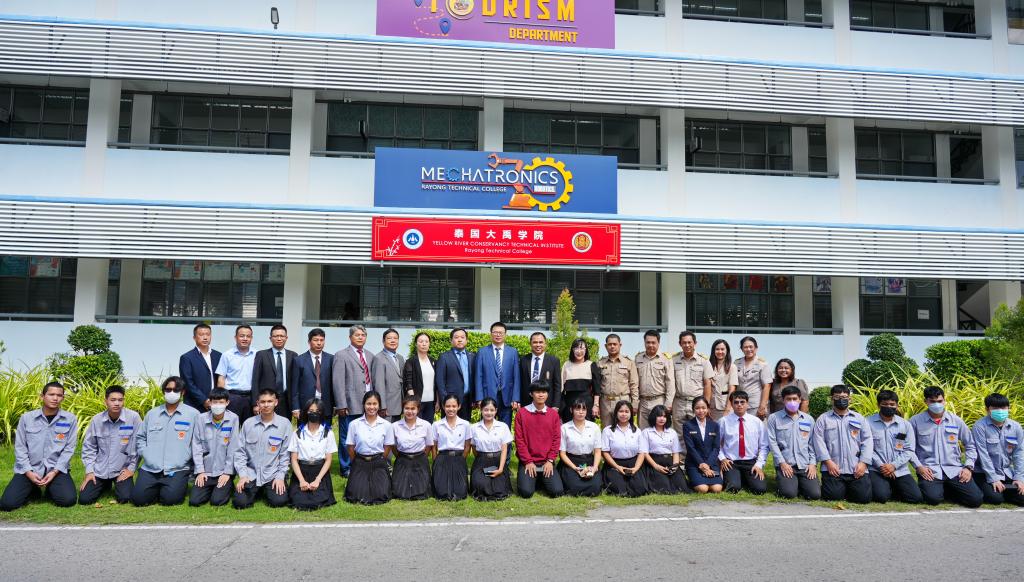 On the morning of November 13, YRCTI’s Thailand Dayu School was inaugurated at Rayong Technical College Thailand. Songchai (宋猜), Chairman of the Vocational Education Committee, Eastern Region, Thailand, YRCTI’s President Hu Hao, Chih Tih P’eng (吉狄蓬), President of Rayong Technical College Thailand, Song Maoxing, Representative of the Yellow River Co., Ltd. Thailand Office, Representative Wang Congde and Deputy Representative Cao Shuanglong of the Sinohydro Foundation Engineering Co., Ltd. Thailand Office, and Qian Qingyu, Deputy General Manager of China Construction Industrial & Energy Engineering Group Co., Ltd., attended the inauguration ceremony. Representatives of teachers from YRCTI and the Rayong Technical College Thailand and the Thai students of the Dayu School also attended the ceremony.