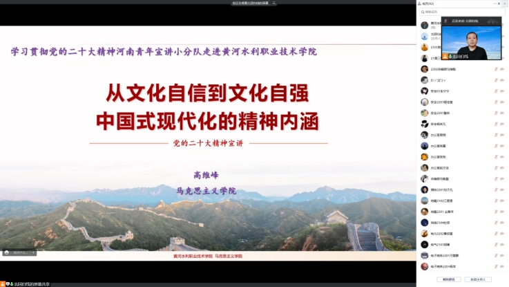 为迅速在全省广大青年中掀起学习宣传党的二十大精神热潮,贯彻落实习近平总书记在陕西延安和河南安阳考察时的重要讲话精神,进一步引导广大青年自觉把思想和行动统一到党的二十大精神上来,近期,共青团河南省委举行学习贯彻党的二十大精神省级示范青年宣讲小分队宣讲活动,根据共青团河南省委安排部署,我校广泛组织动员、创新形式载体、线上线下齐发力,成立了由各级团组织团干部、思政课专职教师、青马班学员等8人组成的青年宣讲小分队,完成为期三天的集中线上培训、精心制定宣讲计划等环节,开启系列宣讲活动。