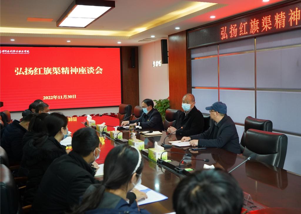 为深入学习贯彻党的二十大精神及习近平总书记在河南安阳红旗渠考察时的讲话精神,11月30日,我校在行政楼第一会议室召开弘扬红旗渠精神座谈会。校党委副书记、工会主席杨士恒出席会议,党委组织部、党委宣传部、学生工作部、团委、水利工程学院、商务与管理学院、马克思主义学院等单位负责人及青年教师、学生代表参加会议。座谈会由党委宣传部部长彭新立主持。