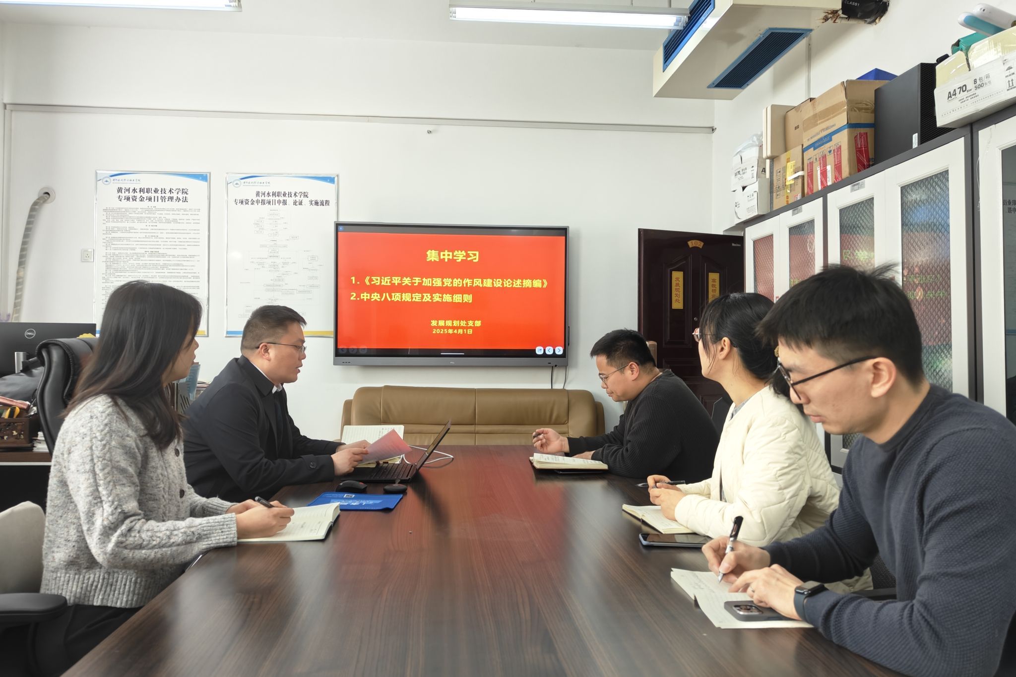 2025年4月1日下午,发展规划处支部召开政治理论学习会议,专题学习《习近平关于加强党的作风建设论述摘编》和中央八项规定及其实施细则。会议由支部书记王忠伟主持,支部全体党员参加会议。
