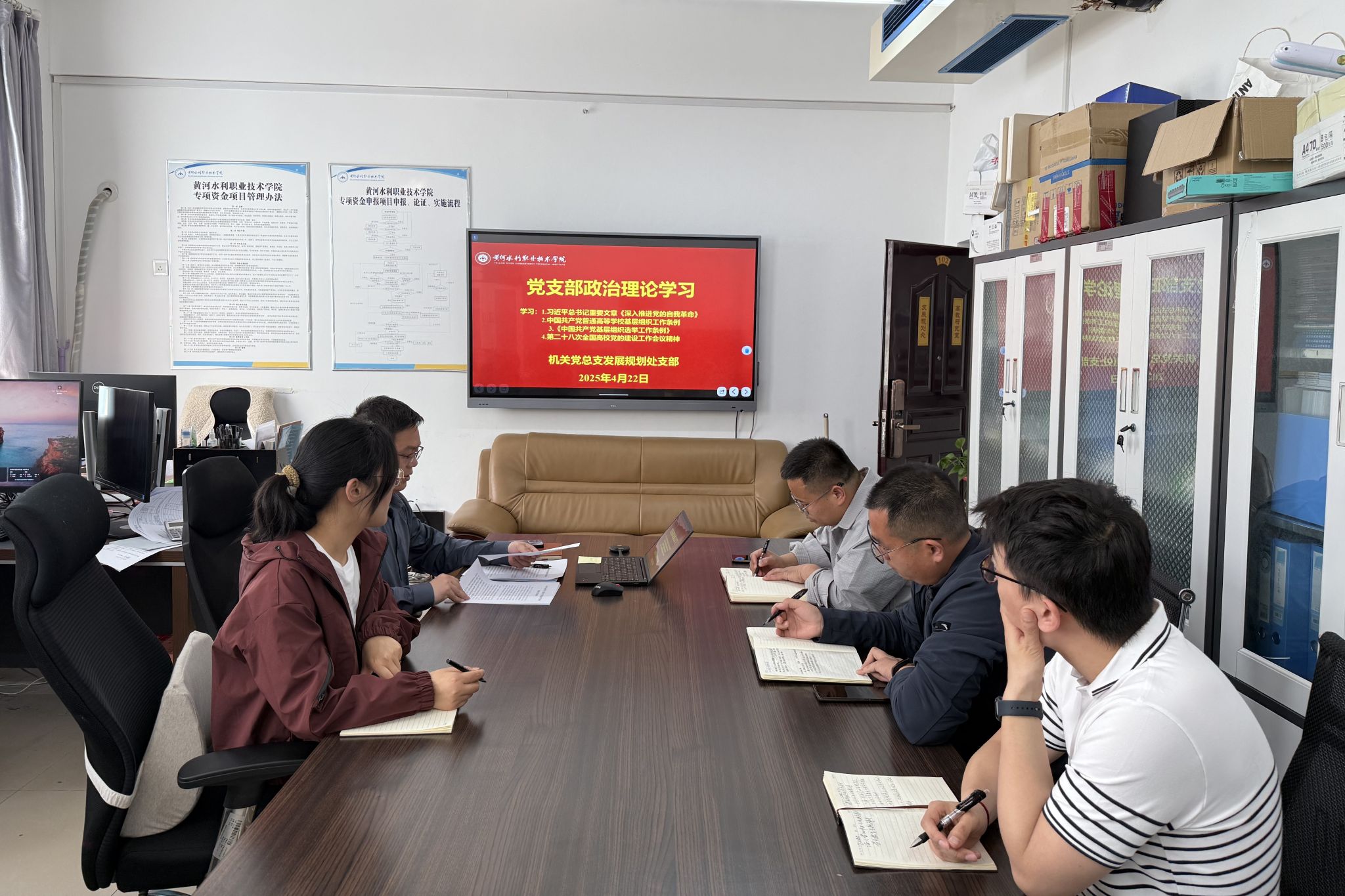2025年4月22日下午,机关党总支发展规划处支部在行政楼102会议室召开政治理论学习会议。支部书记王忠伟主持会议,支部全体在校党员参会。