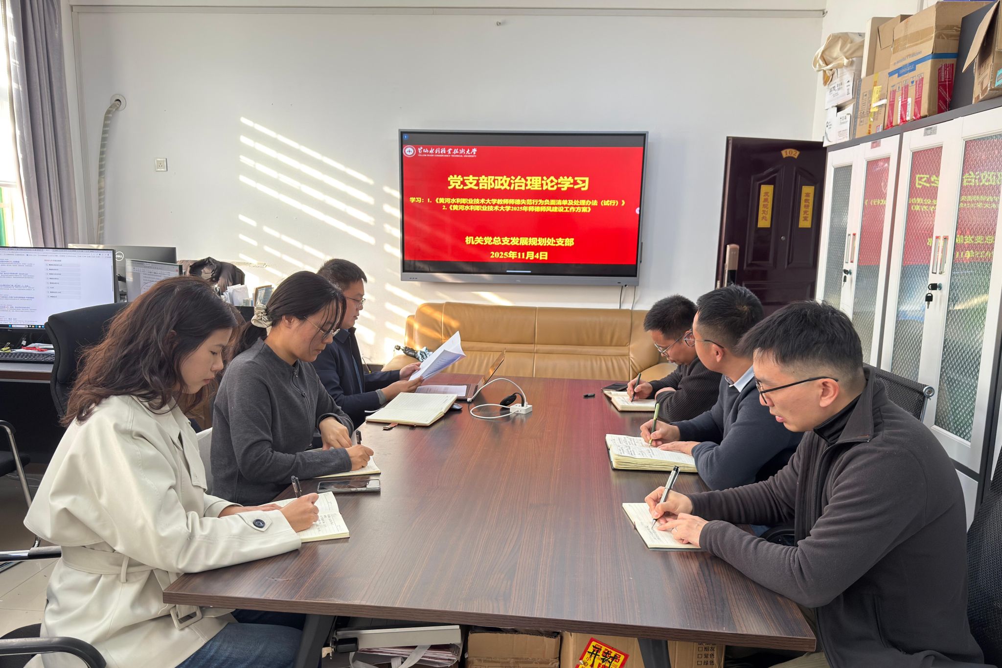 11月4日,发展规划处党支部召开政治理论学习会议,专题学习《黄河水利职业技术大学教师师德失范行为负面清单及处理办法(试行)》和《黄河水利职业技术大学2025年师德师风建设工作方案》。会议由支部书记王忠伟主持,支部全体党员参加会议。
