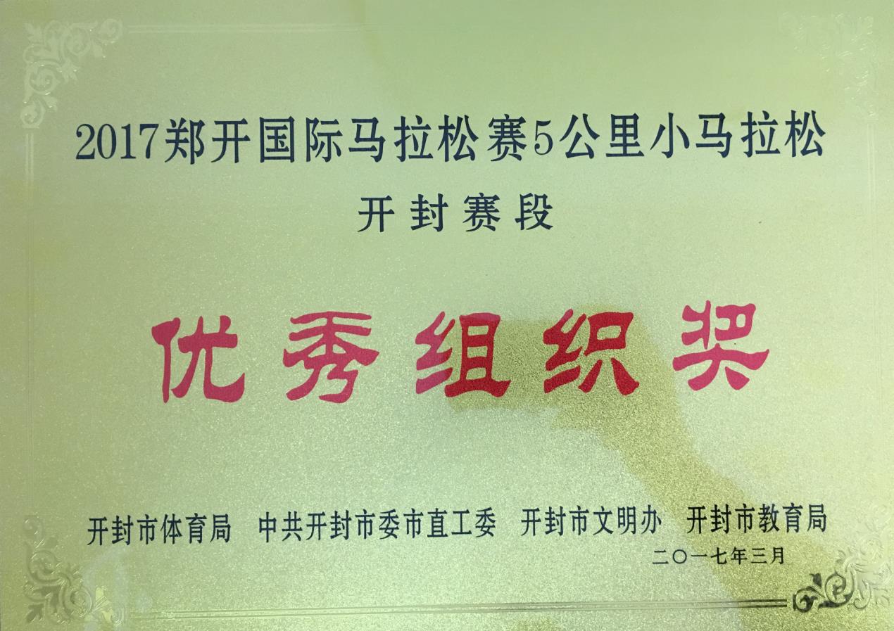 在已经结束的2017年中国郑开国际马拉松赛小马拉松活动(开封段)中,我校获得优秀组织奖荣誉称号。此次活动我校师生共报名参加130余人,活动得到了校领导的高度重视和积极参与,校工会精心组织,认真筹备,确保了本次活动的圆满成功。