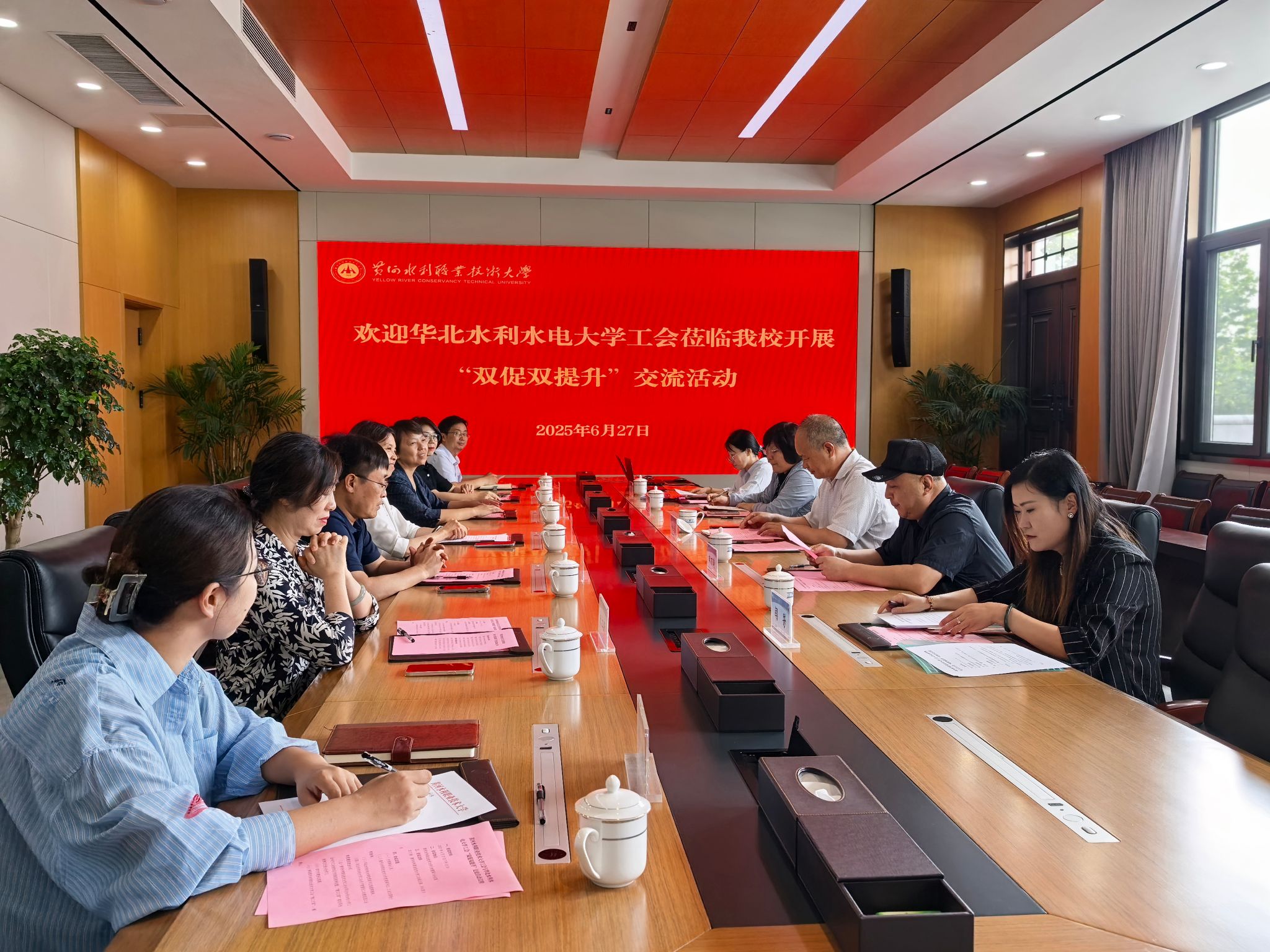 6月27日下午,我校与华北水利水电大学工会“双促双提升”结对共建签约仪式在行政楼第六会议室举行。华北水利水电大学党委副书记焦爱萍,我校党委副书记、工会主席杨士恒出席签约仪式并致辞。华北水利水电大学工会副主席李明霞、潘建波及工会女工委主任谢俊莹,我校工会副主席田万涛、翟志华参加签约仪式,校工会副主席、办公室主任田万涛主持会议。