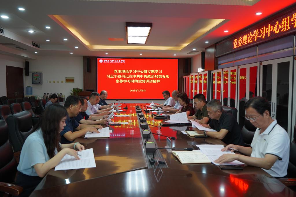 7月3日下午,校党委书记周保平在行政楼第一会议室主持召开校党委理论学习中心组学习会议,专题学习习近平总书记在中共中央政治局第五次集体学习时的重要讲话精神及在文化传承发展座谈会上的重要讲话精神。全体校领导、党委委员,党政办公室、党委组织部、党委宣传部等部门负责人参加学习。