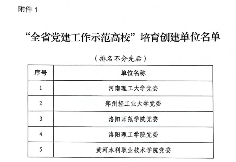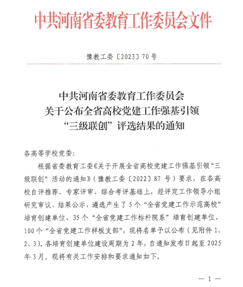 3月29日,在全省高校组织工作会议上,中共河南省委教育工委发布了全省高校党建工作强基引领“三级联创”“双带头人”教师党支部书记工作室以及基层党建创新典型案例评选结果。我校入选“全省党建工作示范高校”,创新创业学院直属党支部入选“全省党建工作样板支部”,教工水利工程与水动党支部入选全省高校“双带头人”教师党支部书记工作室,教工艺术设计党支部的《崇廉尚艺 修德正身——党专融合促清风校园建设》案例获党建创新案例奖。这是我校党建工作取得的又一重大成绩。