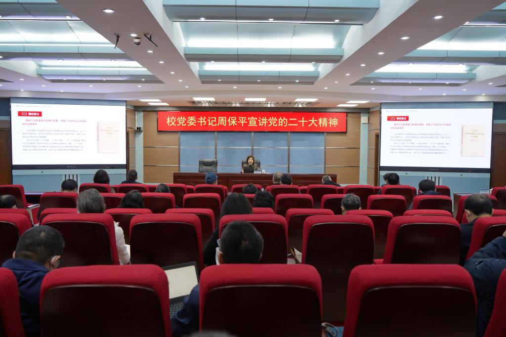 周保平以“一个主题、一个中心任务、三件大事、四个方面里程碑意义、两个结合、六个坚持、中国式现代化五个特征、三方面重点工作、两个全面、五个必由之路”等十个关键词语为切入点,围绕“精研细学,深刻认识党的二十大重大意义;学深悟透,准确把握党的二十大精神实质;细照笃行,办好人民满意的高职教育;勇担使命,争做堪当民族复兴大任的时代新人”等四个方面,以生动鲜活的语言、丰富翔实的资料,全面、准确、完整阐释了党的二十大精神,对党员干部和广大师生提出了期望和要求。她指出,党的二十大继往开来、举旗定向,担负起全党的重托和人民的期待,在政治上、理论上、实践上取得了一系列重大成果,对鼓舞动员全党全国各族人民更加紧密地团结在以习近平同志为核心的党中央周围,高举中国特色社会主义伟大旗帜,坚定道路自信、理论自信、制度自信、文化自信,为全面建设社会主义现代化国家、全面推进中华民族伟大复兴而团结奋斗,具有划时代的里程碑意义。