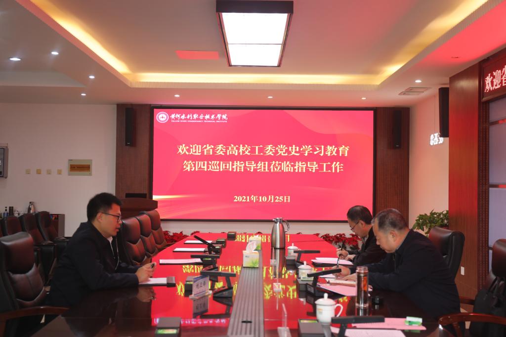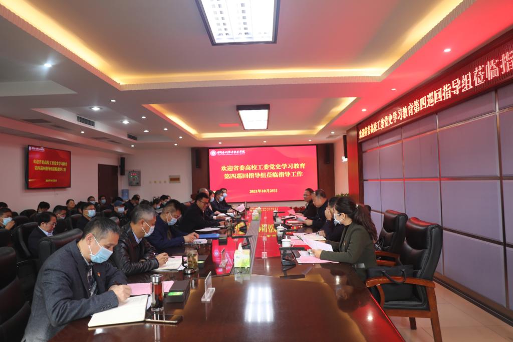 10月25日,省委高校工委党史学习教育第四巡回指导组组长、省教育厅二级巡视员李培俊,指导组成员杨宗辉、胡宪刚、郭婷一行来我校开展第二轮党史学习教育巡回指导。指导组采取汇报会、校领导个人访谈、查阅资料、深入基层党组织座谈交流等方式,对我校党史学习教育开展情况进行指导。校领导胡昊、杨士恒、刘卫锋、焦爱萍、刘玉宾、菅浩然、朱焕立出席汇报会,学校党史学习教育领导小组办公室成员及各党总支(直属党支部)书记参会。汇报会由党委副书记、工会主席杨士恒主持。