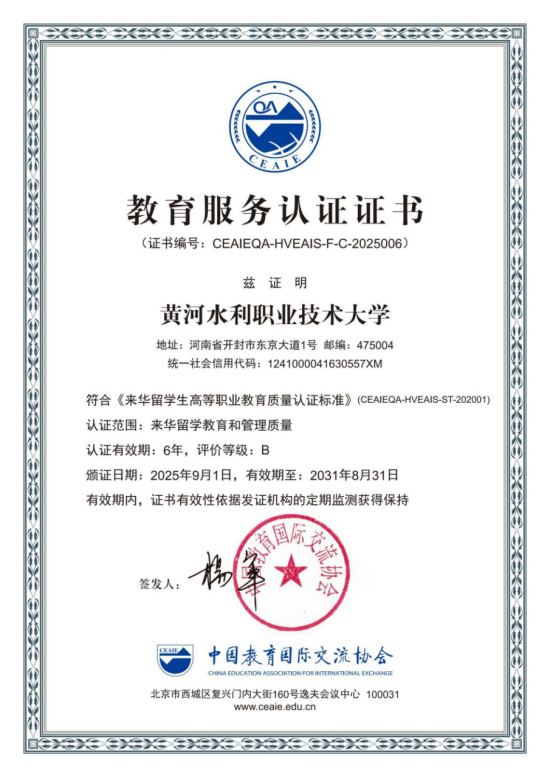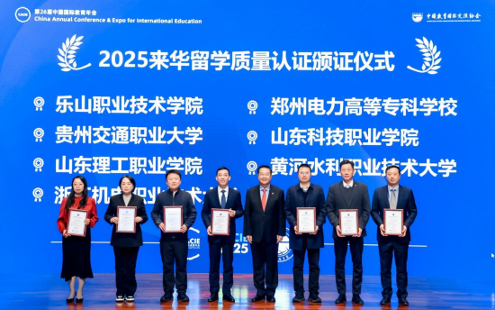 10月30日,在第26届中国国际教育年会上,中国教育国际交流协会发布了“2025年度来华留学生高等职业教育质量认证”结果,我校取得了B级的优异成绩及6年认证有效期。中国教育国际交流协会会长刘利民向高校代表颁发《教育服务认证证书》,校长胡昊代表学校接受颁证。