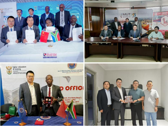 胡昊代表学校与德班马古苏托理工大学、埃萨伊迪职业技术学院签署合作备忘录,推动与两校在工程类国际化人才培养、课程开发、科研合作、师生交流等方面的合作。随后,胡昊一行访问水电十一局南非办事处,与水电十一局非洲分局副局长贾文光就校企国际合作进行深入洽谈,并就技术人才培养、企业员工培训等方面达成合作意向。