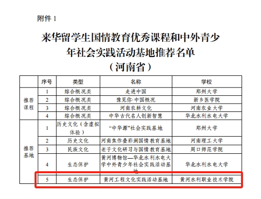 近日,中国教育国际交流协会公布首批“来华留学生国情教育优秀课程和中外青少年社会实践活动基地”推荐名单,我校申报的“黄河工程文化实践活动基地”(生态保护类)成果入选。此次评选中,河南省共入选课程4门、基地5个,我校是全省职业教育领域唯一入选单位。