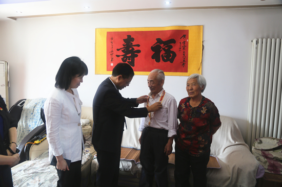 校党委书记许琰为老同志佩戴“庆祝中华人民共和国成立70周年”纪念章