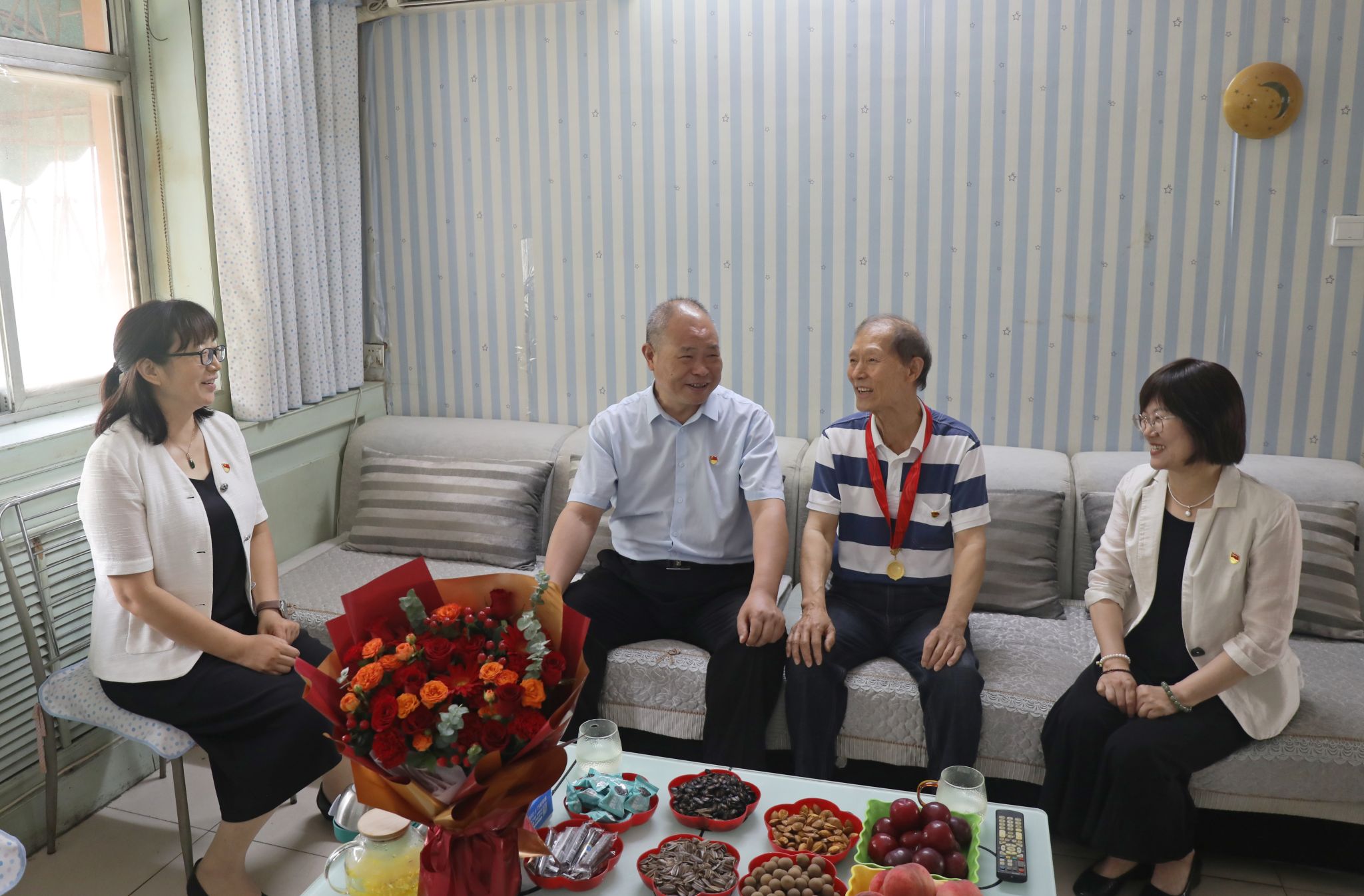 在庆祝中国共产党成立104周年之际,6月25日上午,校党委副书记、工会主席杨士恒带队看望慰问老党员代表,为他们送去党组织的关怀与温暖,并为陈广先、杨贵森等党龄50周年的老党员颁发“光荣在党50年”纪念章。党委组织部和离退休党总支等部门的有关同志参加看望慰问。