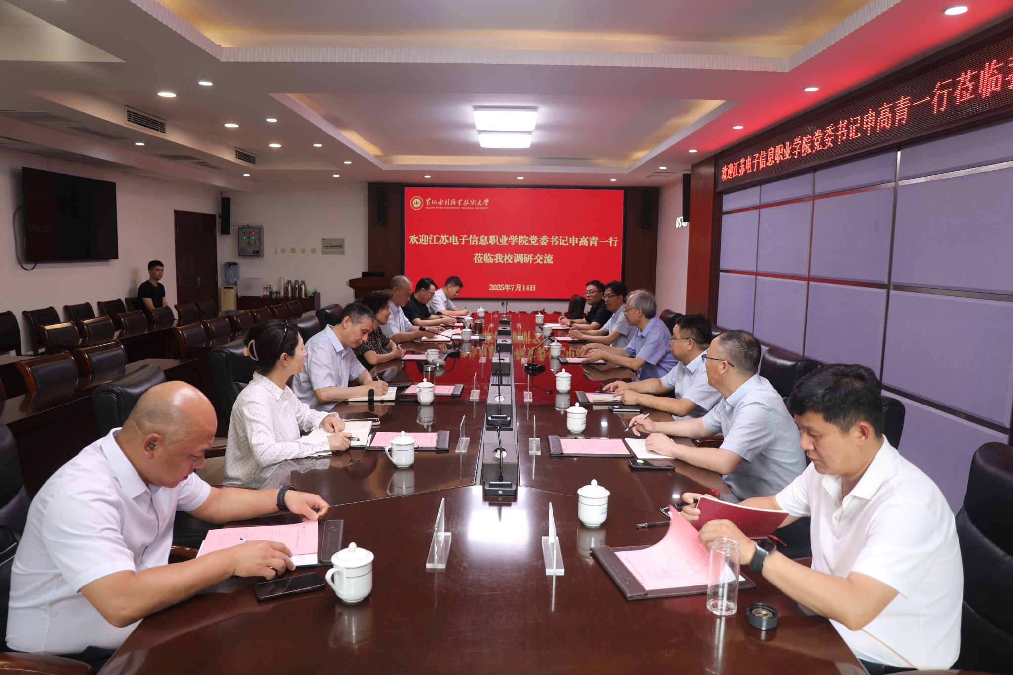 申高青对我校热情接待表示感谢,并对我校“双高校”建设取得的成绩和成功升格职业本科表示由衷祝贺。他简要介绍了江苏电子信息职业学院的办学历史和办学特色,表示希望与黄河水利职业技术大学加强交流,不断拓宽合作领域,深化合作共建。