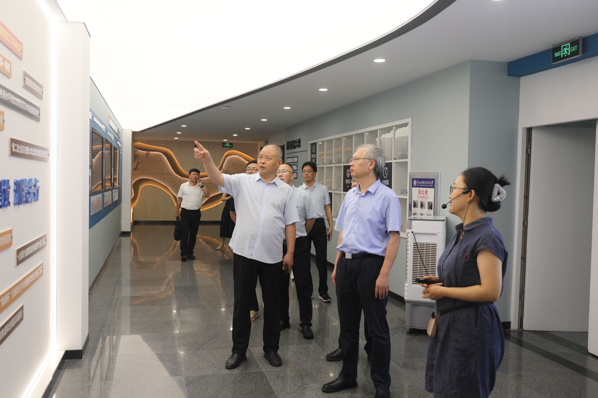杨士恒陪同申高青一行实地考察了我校环境工程学院、测绘工程学院实训场馆、“足迹”文化景观、智慧校园服务大厅、鲲鹏山水利水电仿真实训基地和黄河工程文化长廊等场所。双方就思政教育、人才培养、技能大赛等进行了深入交流。