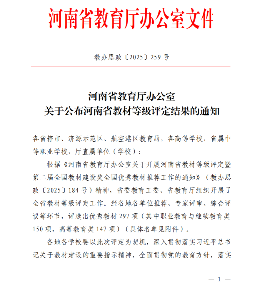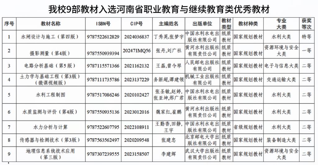 根据《河南省教育厅办公室关于开展河南省教材等级评定暨第二届全国教材建设奖全国优秀教材推荐工作的通知》(教办思政〔2025〕184号)精神,省委教育工委、省教育厅组织开展了全省教材等级评定工作,评选出职业教育与继续教育类优秀教材150项,我校丁秀英,张梦宇教授主编的《水闸设计与施工(第四版)》等9部教材入选并获奖,其中特等奖1部,一等奖1部,二等奖7部。