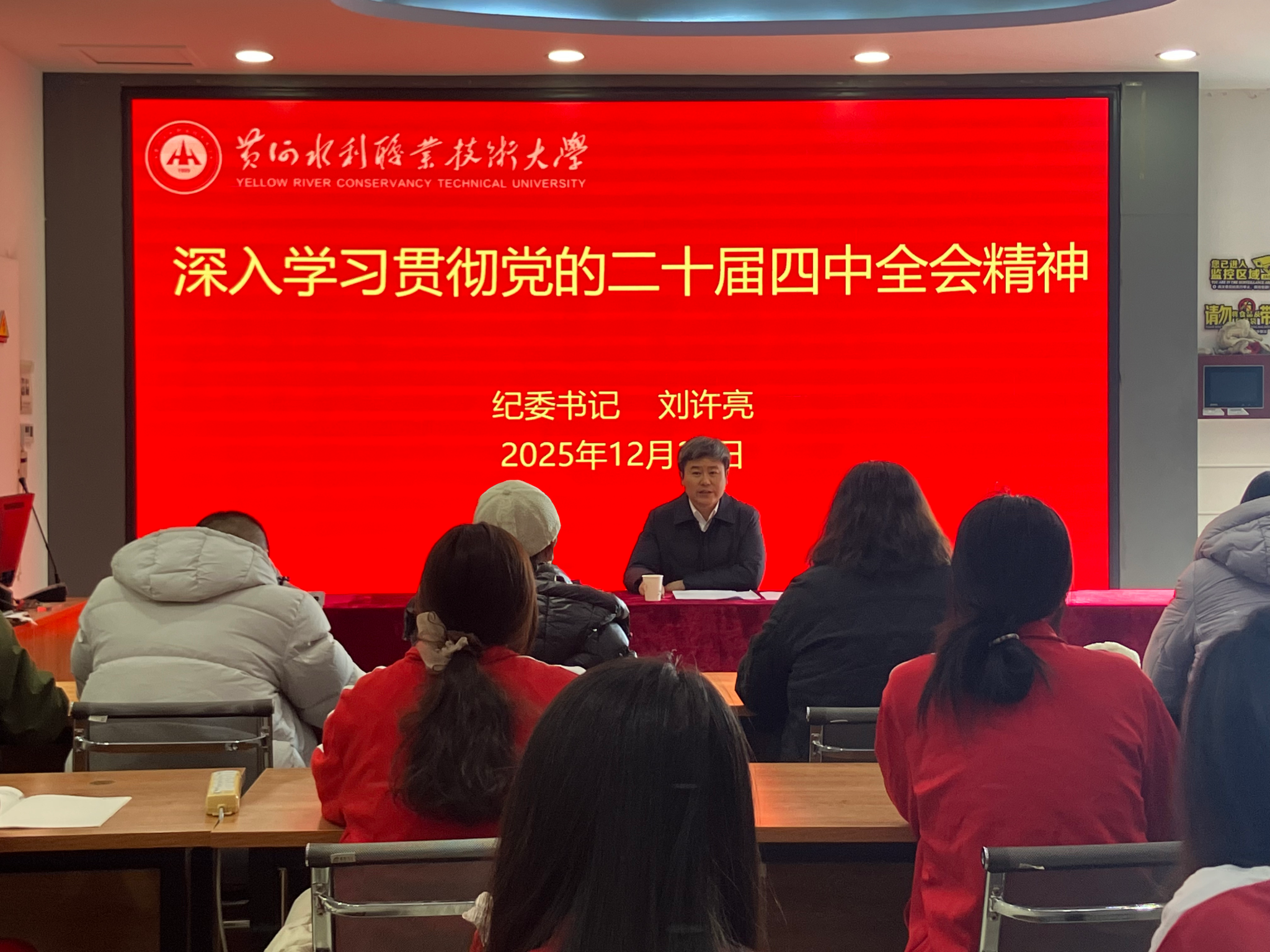 宣讲过程中,校领导们紧扣党的二十届四中全会公报核心内容,结合学校“双高计划”建设、职业本科发展定位及水利行业特色,从全会的重大历史意义、“十五五”时期发展战略部署、教育强国建设的实践要求等方面,对全会精神进行系统阐释和深入解读。杨士恒围绕“强化思想引领、凝聚发展合力”,强调要把全会精神融入立德树人全过程,引导师生将个人理想融入国家水利事业发展大局,在服务黄河流域生态保护和高质量发展中彰显职教担当;菅浩然聚焦“产教融合、科教融汇”,结合专业建设与实训教学实际,解读了全会关于“发展新质生产力”的部署要求,提出要优化专业布局、深化校企合作,提升技术技能人才培养与行业需求的契合度;朱焕立从“高质量发展”角度出发,围绕学科建设、科研创新、社会服务等关键点,勉励师生以全会精神为指引,在水利工程技术攻关、乡村振兴水利帮扶等领域主动作为;周志琦结合学生成长成才需求,强调要将全会精神转化为育人实效,引导青年学子锤炼过硬本领、树立“技能报国”志向,在水利职业赛道上实现人生价值;刘许亮立足全面从严治党要求,从“统筹发展和安全”角度,强调要以全会精神为遵循,筑牢校园安全防线,营造风清气正的育人环境。