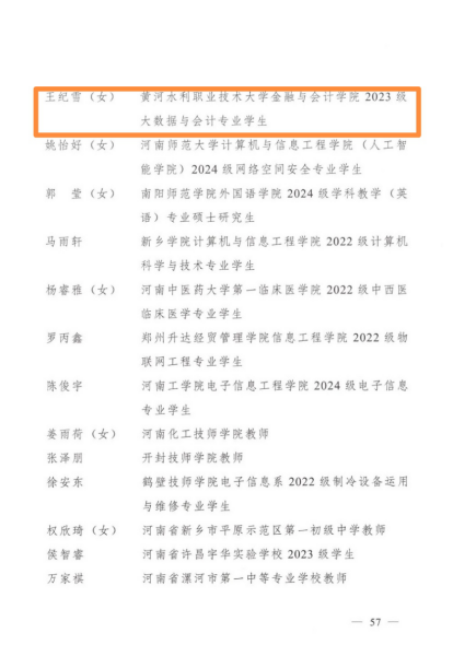 王纪雪曾荣获校“优秀共青团员”“学生组织先进个人”“青年志愿服务先进个人”、开封市三好学生、河南省优秀大中专毕业生、国家励志奖学金获得者、河南省三好学生等荣誉。她深入学习贯彻习近平新时代中国特色社会主义思想、党的二十大精神,探索“理论铸魂 + 专业赋能”的深度融合路径,化身团史宣讲员用“青言青语”讲活红色故事,在沉浸式宣讲中传递青春担当与责任力量;学业上,她专注听讲、潜心钻研,课后主动牵头组建学习小组,带领同学攻坚克难、攻破知识难点,个人学业成绩始终稳居班级前列;担任校学生会学生干部期间,她立足服务同学的初心使命,牵头策划组织“理论学习月”“思辨青春辩论赛”等系列校园文化活动,以丰富多元的活动载体激活校园文化活力,组织并参与“讲好黄河故事 延续历史文脉”治黄历史故事情景剧大赛、“逐梦新时代 奋进向未来”新年文艺晚会、“携手志愿•筑梦前行”学雷锋系列等志愿服务,服务累计时长200小时;在专业竞赛的赛场上,她锐意创新、奋勇争先,凭借扎实的专业功底和锐意进取的拼搏精神,先后斩获第五届“衡信杯”个税师精英挑战赛二等奖、第五届“浪潮杯”数智企业共享财务大赛三等奖、“一带一路”暨金砖国家技能发展大赛团体优秀奖、第五届“首冠杯”全国大数据分析技能应用大赛三等奖等多项荣誉,尽显专业素养与青春风采。