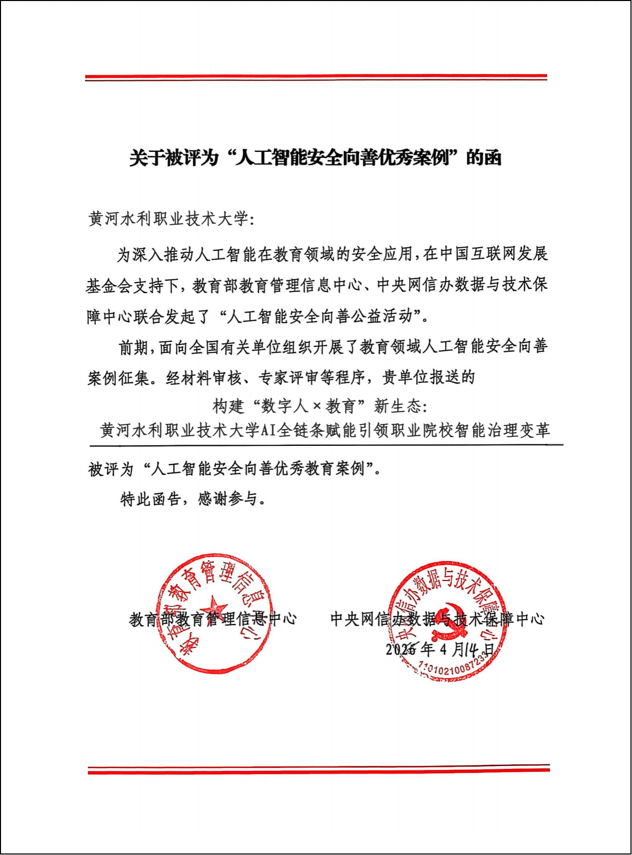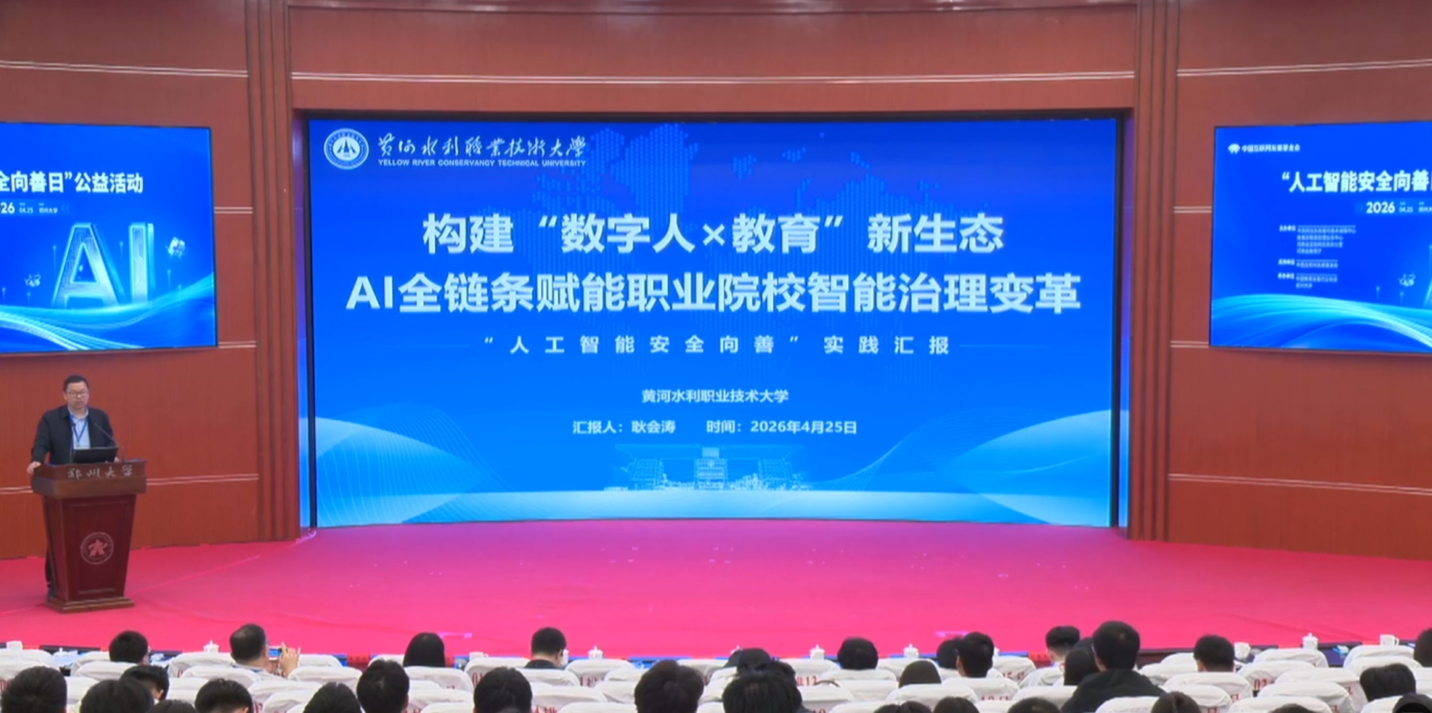 4月25日,由中央网信办数据与技术保障中心、教育部教育管理信息中心、河南省互联网信息办公室、河南省教育厅主办,中国教育装备行业协会、郑州大学承办的“人工智能安全向善日”公益活动在郑州大学举办,来自各地教育行政部门、各级各类学校、相关企业及师生代表共400余人参加活动。我校推荐的案例《构建数字人×教育新生态——黄河水利职业技术大学AI全链条赋能职业院校智能治理变革》入选优秀案例并作案例分享。国家智能社会治理实验基地建设办公室、发展规划处负责人受邀参加公益活动。