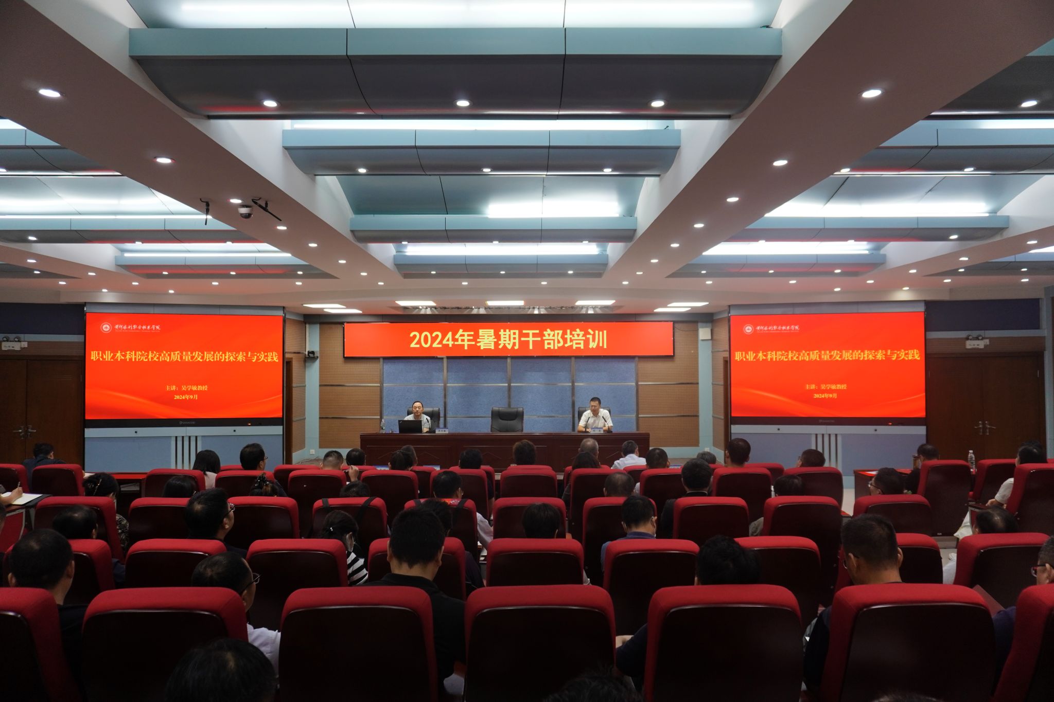 本次干部培训班共安排8场专题讲座,先后邀请了省委党校教授杨伟民、赵璐做党性教育、廉洁教育专题报告,中国高等教育学会职业技术教育分会理事长周建松教授、国家职业教育指导咨询委员会委员徐国庆教授、教育部教育强国建设战略咨询委员会委员孙善学教授、南京工业职业技术大学原党委书记吴学敏教授、高校高层次拔尖领军人才刘晓教授等职教领域的资深专家学者对学校在新形势下保持优势和高质量发展的办学思路、行动策略开展专题辅导。培训期间,全体学员分成7个讨论组,由校领导分别带领,围绕“党的二十届三中全会精神”“师资队伍建设与发展”“产教融合”等三个专题,深入开展交流研讨,达到了相互提升、相互促进的目的。