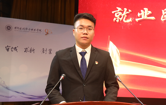 水利工程学院安全技术与管理专业学生娄书源代表毕业生发言,对为毕业生提供就业平台的用人单位和精心培养学生的学校表示衷心感谢,并表示一定要牢记老师的殷切期望和深情嘱托,做拥有智慧并富有激情、仰望星空并脚踏实地、德才兼备并勇于创新、富有责任并敢挑重担的全面发展的青年人。