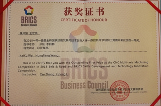 为进一步促进技能发展和技能人才培养,金砖国家工商理事会(BRICS BC)、金砖国家技能发展与技术创新大赛组委会、“一带一路”暨金砖国家技能发展国际联盟(IASDBR)于9月4日—8日在河北廊坊职业技术学院举办2018“一带一路”暨金砖国家技能发展与技术创新大赛“数控多轴加工”赛项中国赛区决赛。我校选派由李自鹏带队,魏开旭、王宏亮为参赛选手的代表队参赛,经过激烈角逐,取得该赛项一等奖第一名的佳绩,成功晋级即将在南非举办的国际总决赛。
