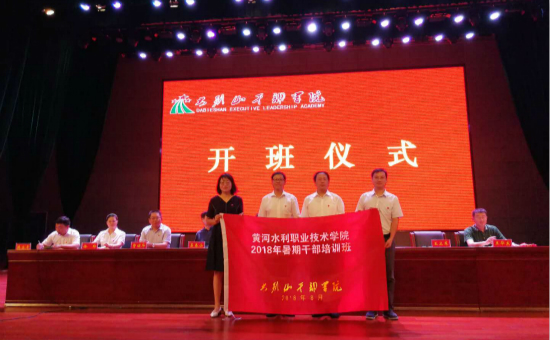 大别山干部学院副调研员牛长立博士和我校党委副书记、工会主席王卫东共同为我校培训班授班旗